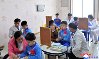 平壌の朝鮮障害児回復院(障害者入所施設)で入学式後に最初の授業を受ける児童=2026.4.1