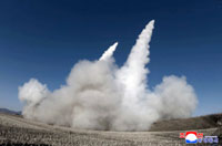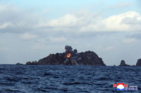 朝鮮ミサイル総局が行った新型大口径ロケット砲の試射で標的に着弾する様子=2026.1.27