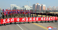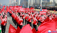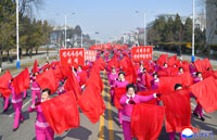 朝鮮労働党第9回大会の決定貫徹を呼び掛けて平壌市内を行進する朝鮮社会主義女性同盟の活動家と同盟員=2026.3.12