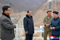 竣工を控えた咸鏡南道の端川発電所の第1段階建設現場を視察する朴泰成首相(中央)=26年4月12日朝鮮中央通信報道